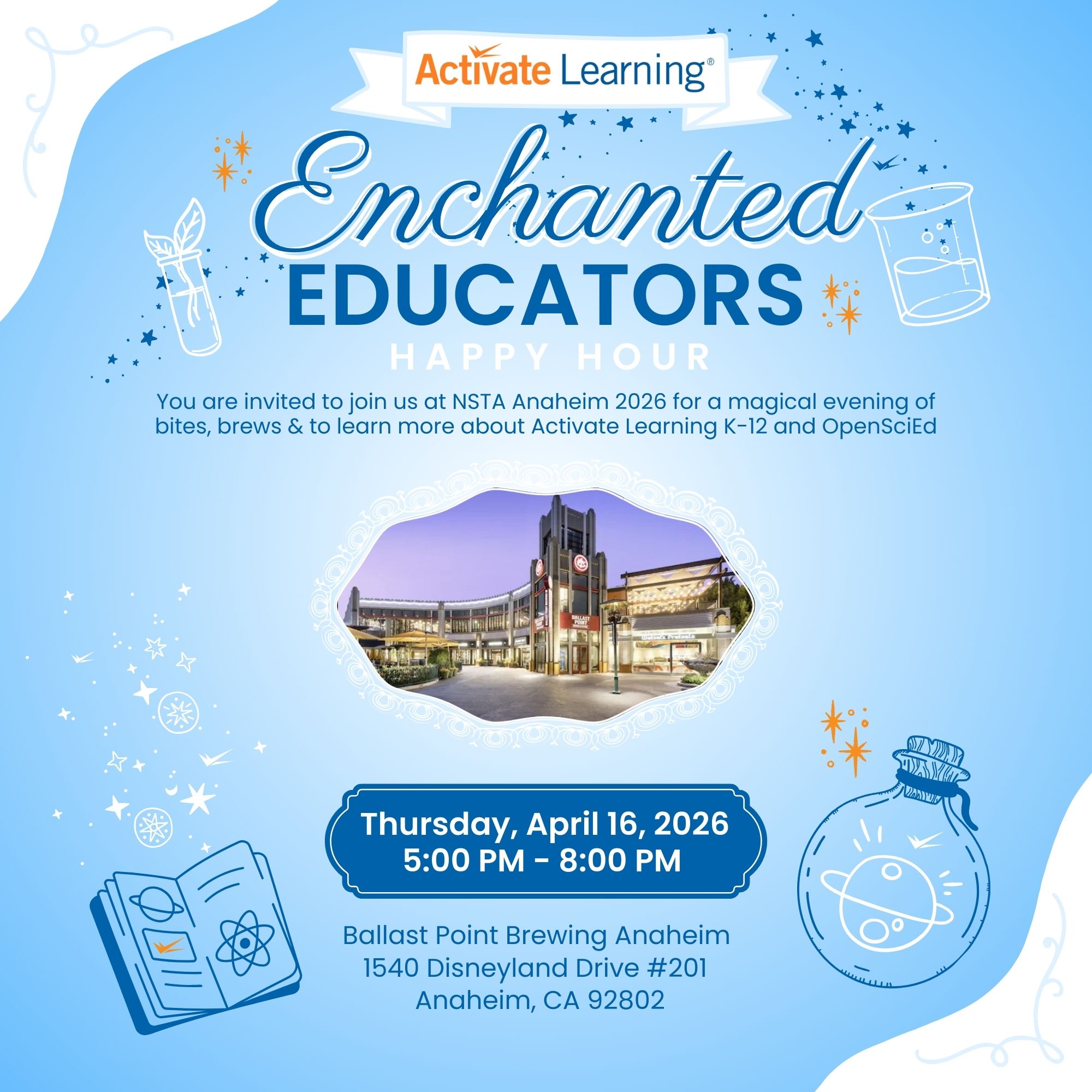 After a full day of learning, unwind with us in Downtown Disney! We're hosting the Enchanted Educators Happy Hour at Ballast Point Brewing, an evening of great food, cold drinks, and great conversation with fellow science educators. Get a closer look at our latest K-12 solutions and OpenSciEd offerings in a relaxed, fun setting.